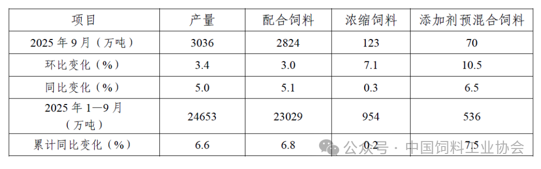 表1 2025年9月全国工业饲料生产情