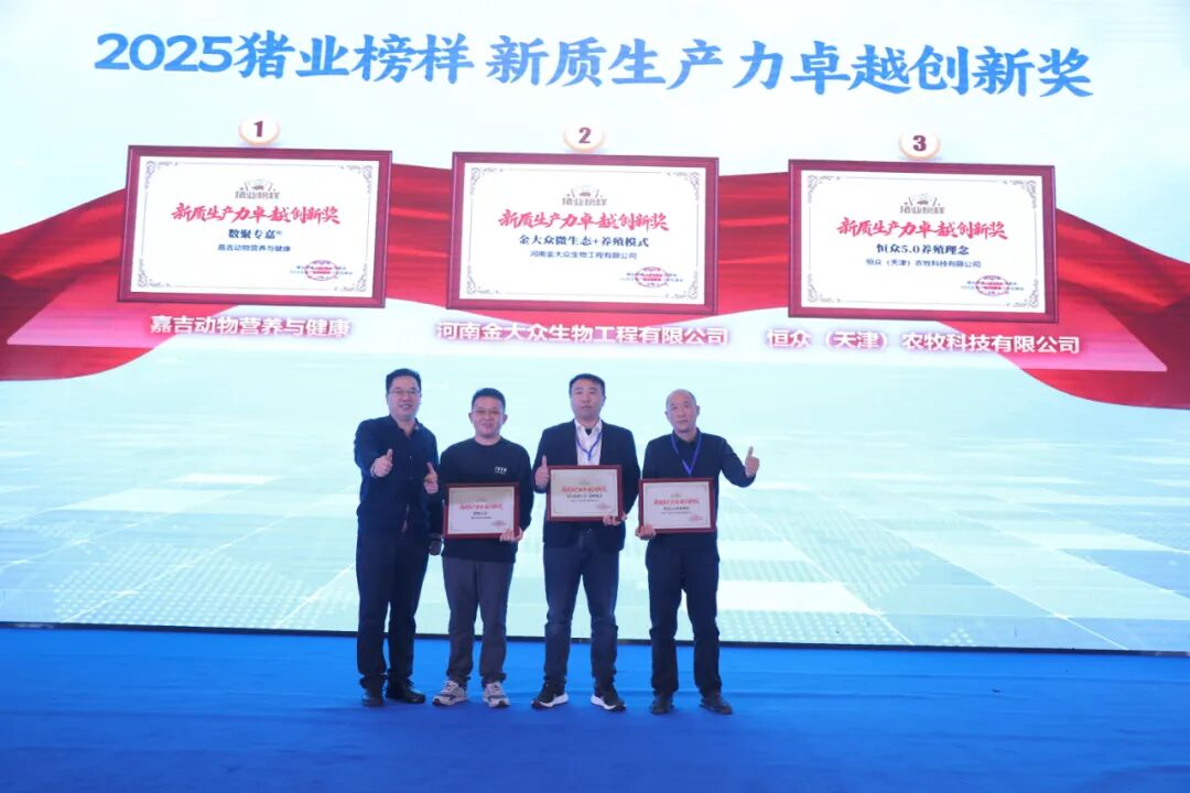 7日晚,在“民望之夜”答谢晚宴暨2025猪业榜样颁奖典礼环节,河南金大众生物工程有限公司微生态+养殖模式荣获“新质生产力卓越创新奖”荣誉称号,并颁发了奖牌。