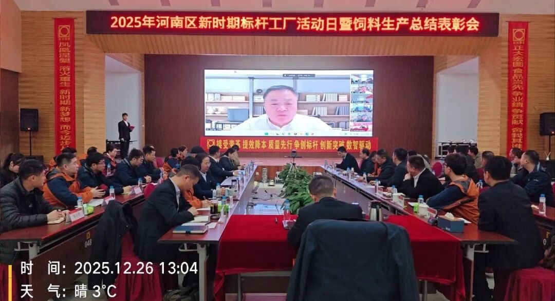 河南区饲料事业生产总监助理吕涛全面总结河南区饲料厂2025年工作成果。河南区饲料事业生产总监陈喜民对2026年生产工作做整体规划,围绕“一个中心、两个基本点、三快战略、四项保障、提高五率、优化五费、实现六化”策略,细化“SHE、目标管理、CPPM、创新、两单两三及团队文化”措施,推动各项工作再上新台阶。