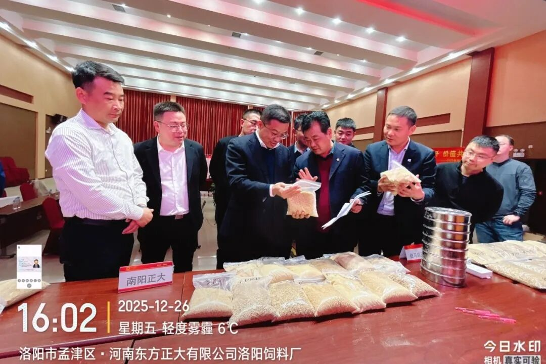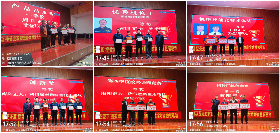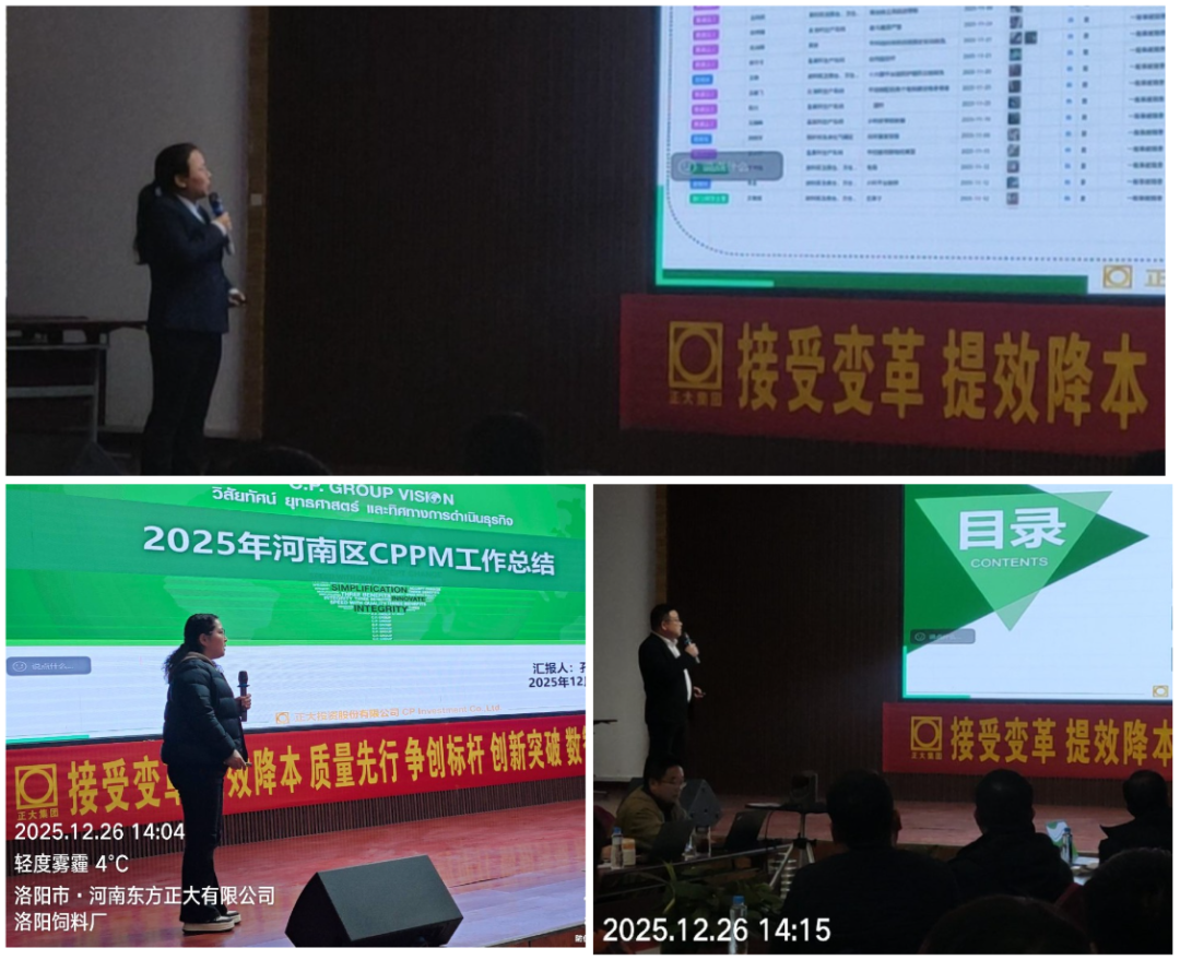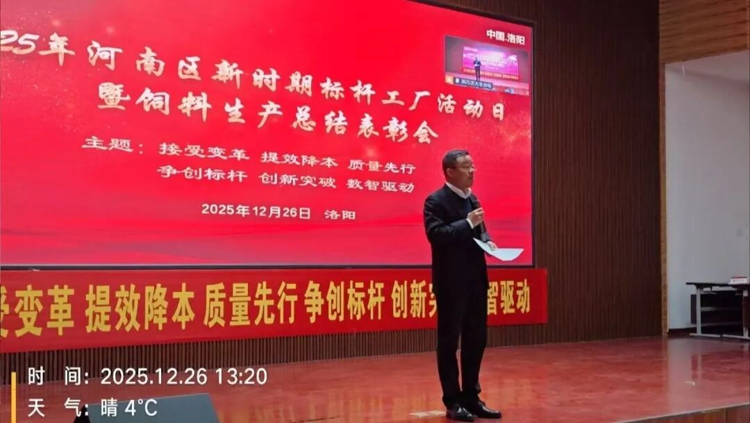 12月26日,为推进河南区饲料厂标准化工厂建设,分享创新改善成果,提升全员效率意识、质量意识及关键岗位操作技能,2025年河南区新时期标杆工厂活动日暨饲料生产总结表彰会以“线下+线上”相结合的形式成功举办。饲料生产职能线副董事长卢铁、总监裴赛,河南区饲料事业副总裁王停战、品管总监万涛、河南东方正大有限公司洛阳饲料厂总经理王俊伟等特邀出席,各饲料厂厂长、CPPM专员及生产部员工代表共同参与,凝聚起“接受变革,提效降本,质量先行;争创标杆,创新突破,数智驱动”的奋进力量。