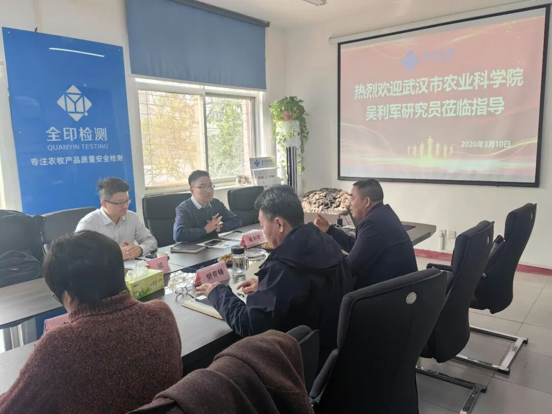2026年3月10日,武汉市农业科学院畜牧兽医研究所何斌博士、吴利军博士莅临全印检测技术交流,公司董事长付立亭、总经理李金荣、技术专家樊克锋热情接待,双方围绕新兽药、新饲添研发和注册申报等核心议题展开深度探讨。