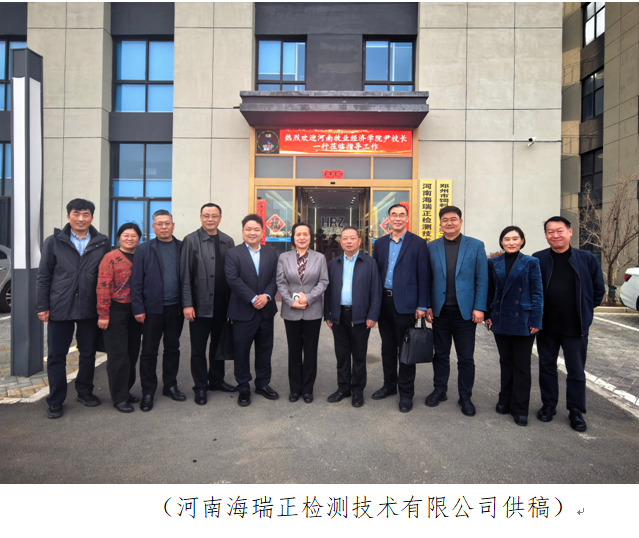春潮涌动启新篇,校企携手向未来。2026年3月25日,河南牧业经济学院校长尹新明一行8人再次莅临河南海瑞正检测技术有限公司走访调研,校工会、社会服务办公室、校友工作办公室、科技处、畜产品研究院等相关部门负责人陪同调研,此次到访恰逢海瑞正检测乔迁新址不久,双方以实地考察、座谈交流的形式,共话产教融合新路径,共商校企合作新篇章。这是继 2025年3月18日尹校长一行首次到访后的再度深入交流,标志着双方校企合作迈入更深层次、更高质量的发展阶段。