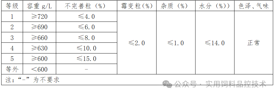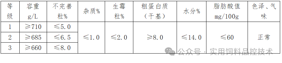 个感官指标,同样对脂肪酸值做出要求。其对玉米的质量要求如下: