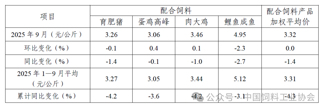 表3  2025年9月饲料企业浓缩饲料和添加剂预混合饲料平均价格