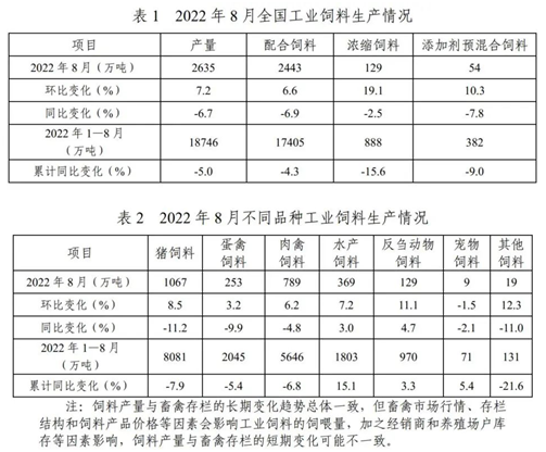 据样本企业数据测算,2022年8月,全国工业饲料产量2635万吨,环比增长7.2%,同比下降6.7%。从品种看,猪饲料产量1067万吨,环比增长8.5%,同比下降11.2%;蛋禽饲料产量253万吨,环比增长3.2%,同比下降9.9%;肉禽饲料产量789万吨,环比增长6.2%,同比下降4.8%;水产饲料产量369万吨,环比增长7.2%,同比增长3.0%;反刍动物饲料产量129万吨,环比增长11.1%,同比增长4.7%。2022年1—8月,全国工业饲料总产量18746万吨,同比下降5.0%。其中,猪、蛋禽、肉禽饲料产量分别为8081万吨、2045万吨、5646万吨,同比分别下降7.9%、5.4%、6.8%;水产、反刍动物饲料产量分别为1803万吨、970万吨,同比分别增长15.1%、3.3%。