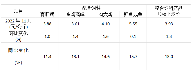 表3 2022年11月饲料企业浓缩饲料和添加剂预混合饲料平均价格